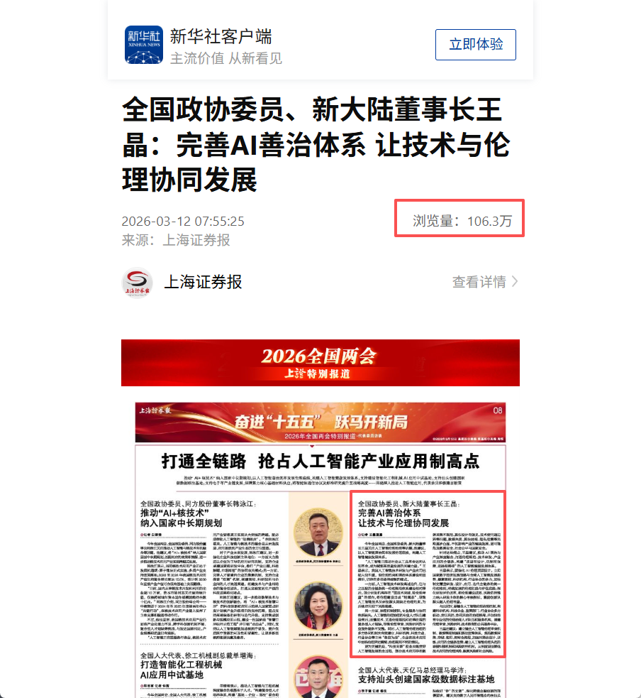 新華社刊發上海證券報《全國政協委員王晶:完善AI善治體系 讓技術與倫理協同發展》,單篇閱讀量已突破百萬。