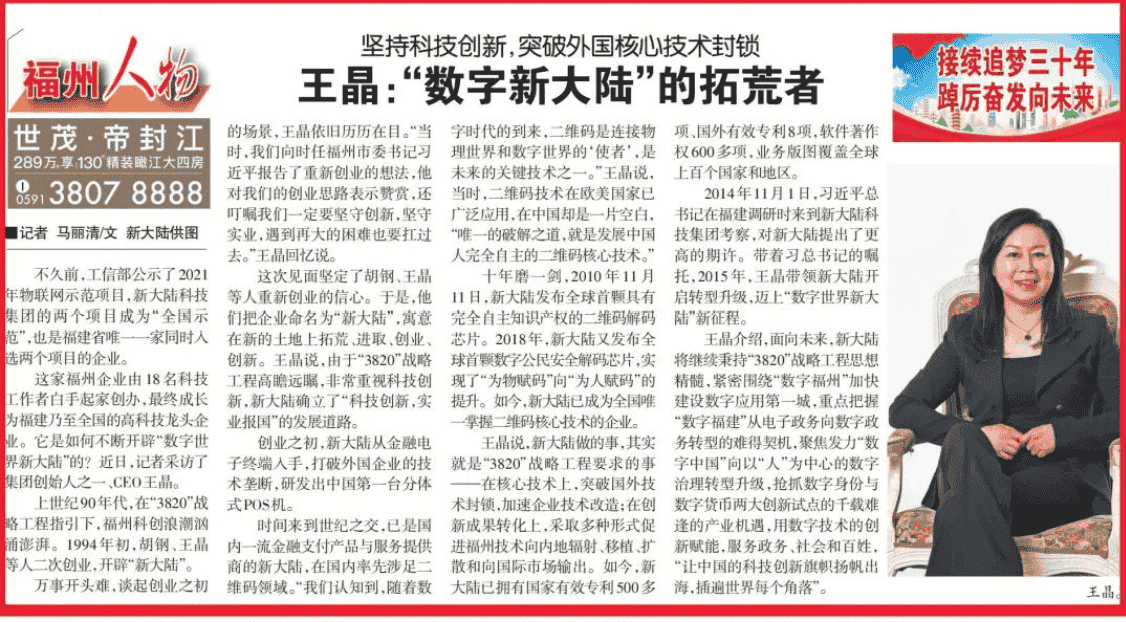 證券時報——新大陸:工業時代向數字時代演...《福州晚報》:新大陸“一碼通行”服務將在...福州晚報——王晶:“數字新大陸”的拓荒者福州電視臺——王晶:科技創新開辟“新大陸...