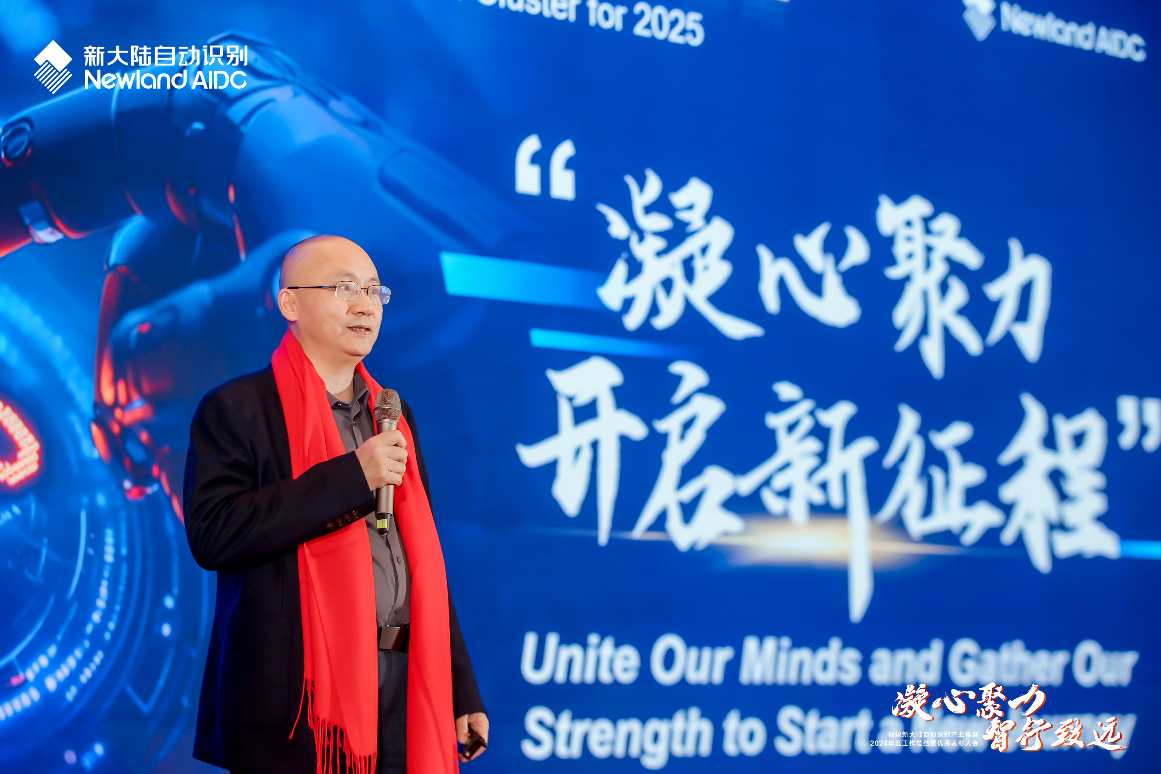 大會期間,新大陸自動識別產(chǎn)業(yè)集群經(jīng)營班子和骨干成員登臺,共同完成了“凝心聚力,開啟新征程”啟動儀式。海外營銷事業(yè)部、國內(nèi)營銷事業(yè)部、研發(fā)中心、供應鏈中心負責人以及歐洲公司CEO Peter Sliedrecht在現(xiàn)場或通過視頻分別發(fā)表宣言,吹響2025奮斗的號角。